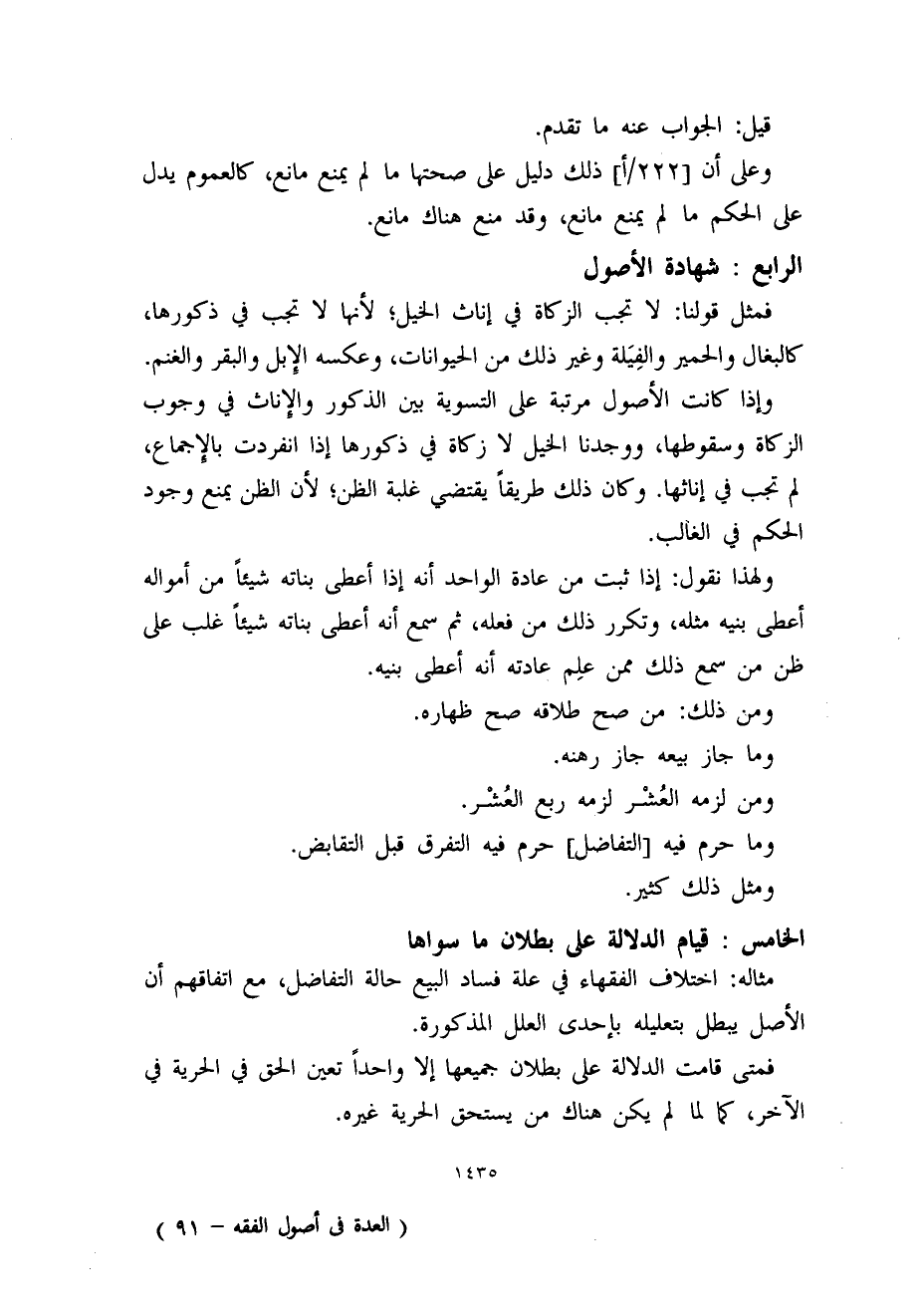 وإذا كانت الأصول مرتبة على التسوية بين الذكور والإناث في وجوب الزكاة وسقوطها، ووجدنا الخيل لا زكاة في ذكورها إذا انفردت بالاجماع، لم تجب في إناثها. وكان ذلك طريقاً يقتضي غلبة الظن؛ لأن الظن يمنع وجود الحكم في الغالب.