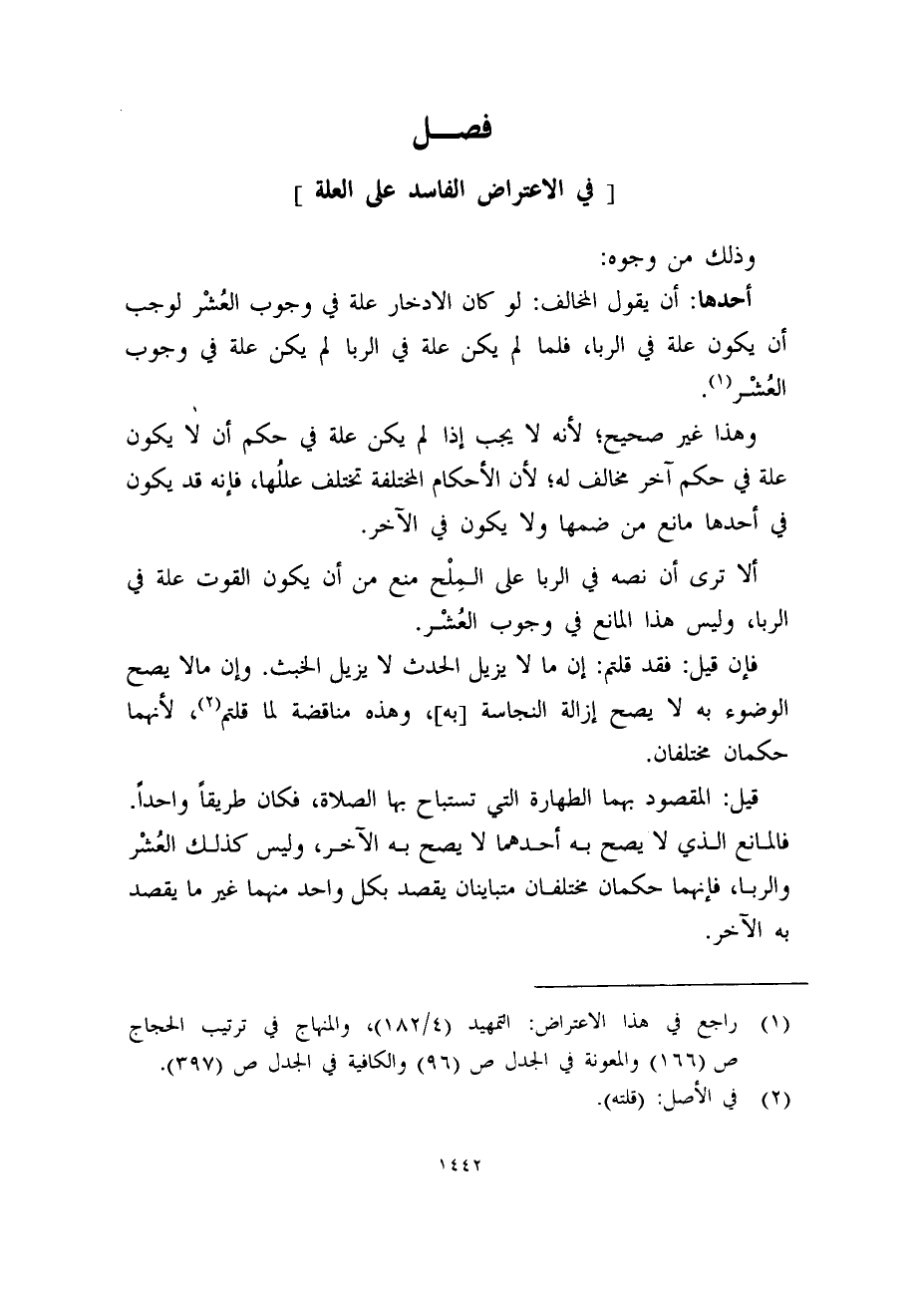 (1) راجع في هذا الاعتراض: التمهيد (4/182) ، والمنهاج في ترتيب الحجاج ص (166) والمعونة في الجدل ص (96) والكافية في الجدل ص (397) .