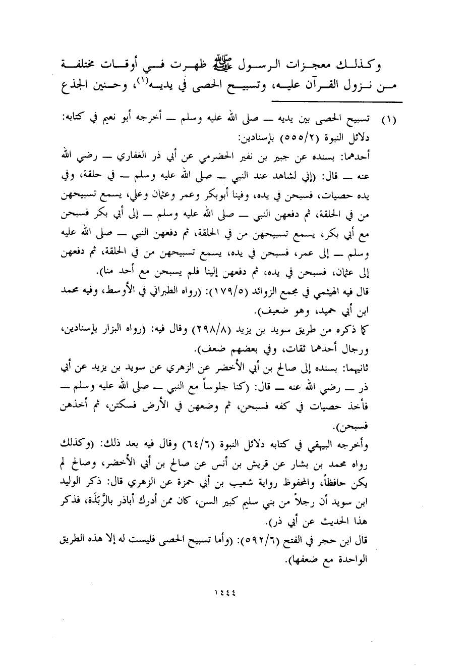 ثانيهما: بسنده إلى صالح بن أبي الأخضر عن الزهري عن سويد بن يزيد عن أبي ذر - رضي الله عنه - قال: (كنا جلوساً مع النبي - صلى الله عليه وسلم - فأخذ حصيات في كفه فسبحن، ثم وضعهن في الأرض فسكتن، ثم أخذهن فسبحن) .