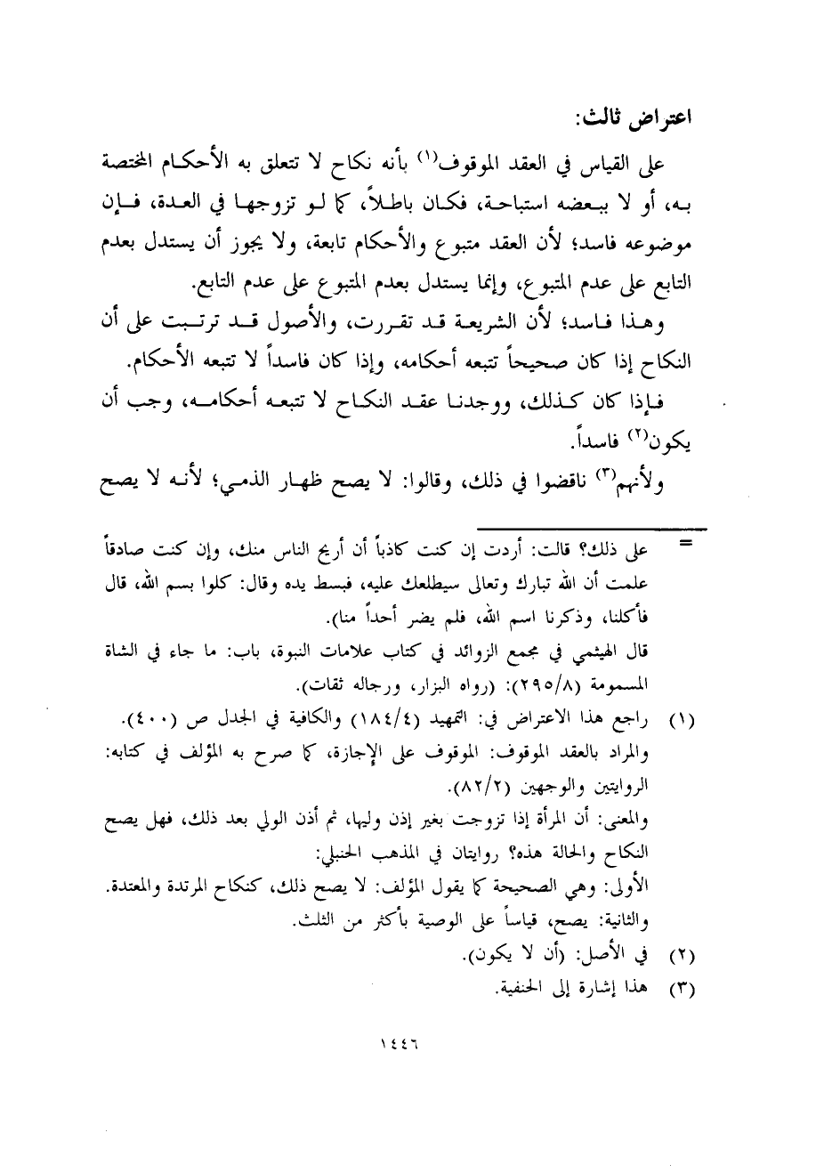 على القياس في العقد الموقوف (1) بأنه نكاح لا تتعلق به الأحكام المختصة به، أو لا ببعضه استباحة، فكان باطلاً، كما لو تزوجها في العدة، فإن موضوعه فاسد؛ لأن العقد متبوع والأحكام تابعة، ولا يجوز أن يستدل بعدم التابع على عدم المتبوع، وإنما يستدل بعدم المتبوع على عدم التابع.