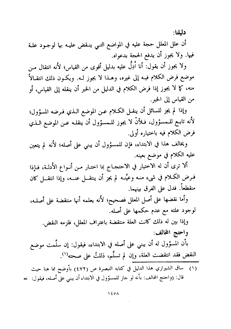 (1) ساق الشيرازي هذا الدليل في كتابه التبصرة ص (472) بأوضح مما هنا حيث قال: (واحتج المخالف: بأنه لو جاز للمسؤول في الابتداء أن يبنى على أصله، فيقول: =
