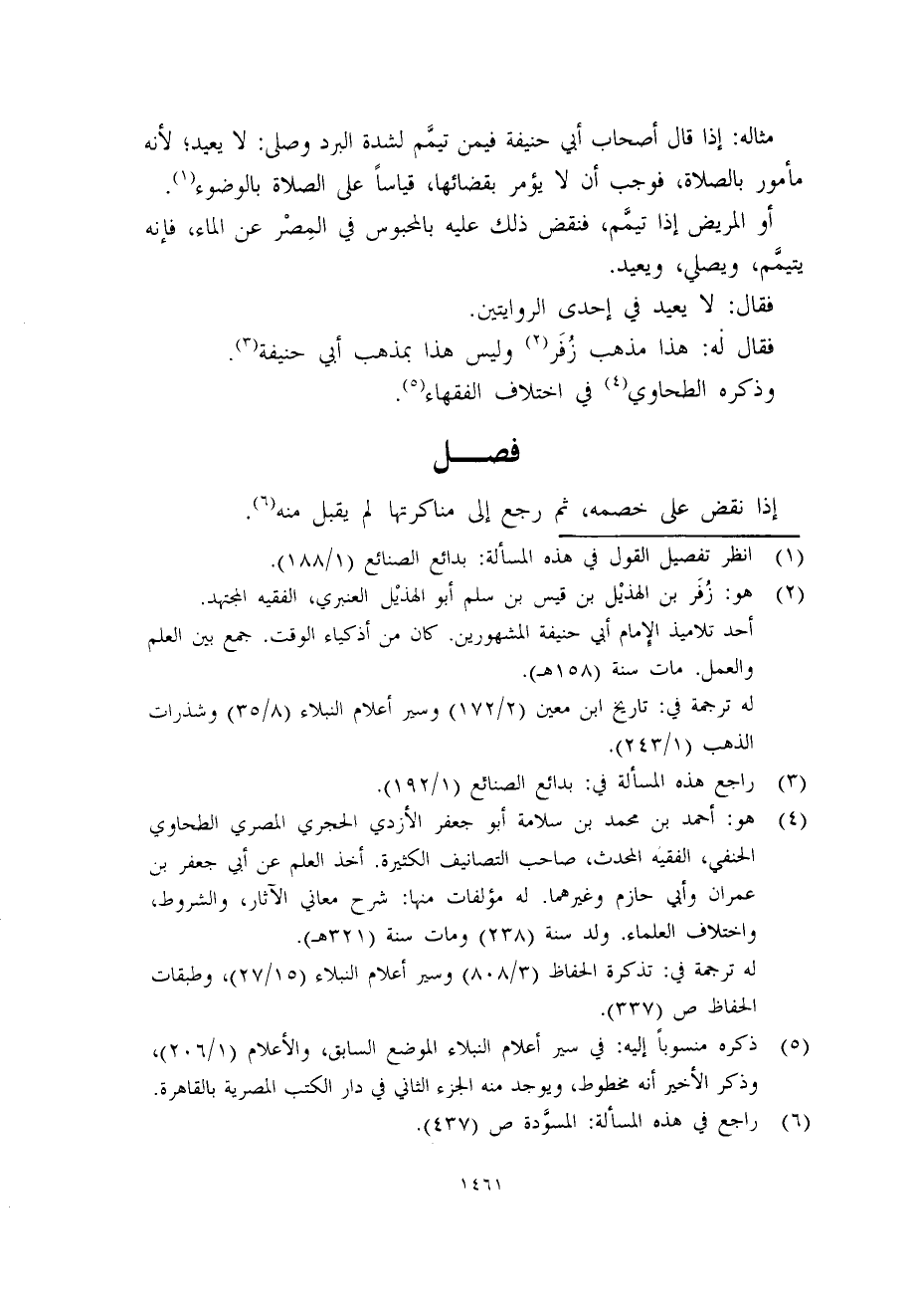 (4) هو: أحمد بن محمد بن سلامة أبو جعفر الأزدي الحجري المصري الطحاوي الحنفي، الفقيه المحدث، صاحب التصانيف الكثيرة. أخذ العلم عن أبي جعفر بن عمران وأبي حازم وغيرهما. له مؤلفات منها: شرح معاني الآثار، والشروط، واختلاف العلماء. ولد سنة (238) ومات سنة (321 هـ) .