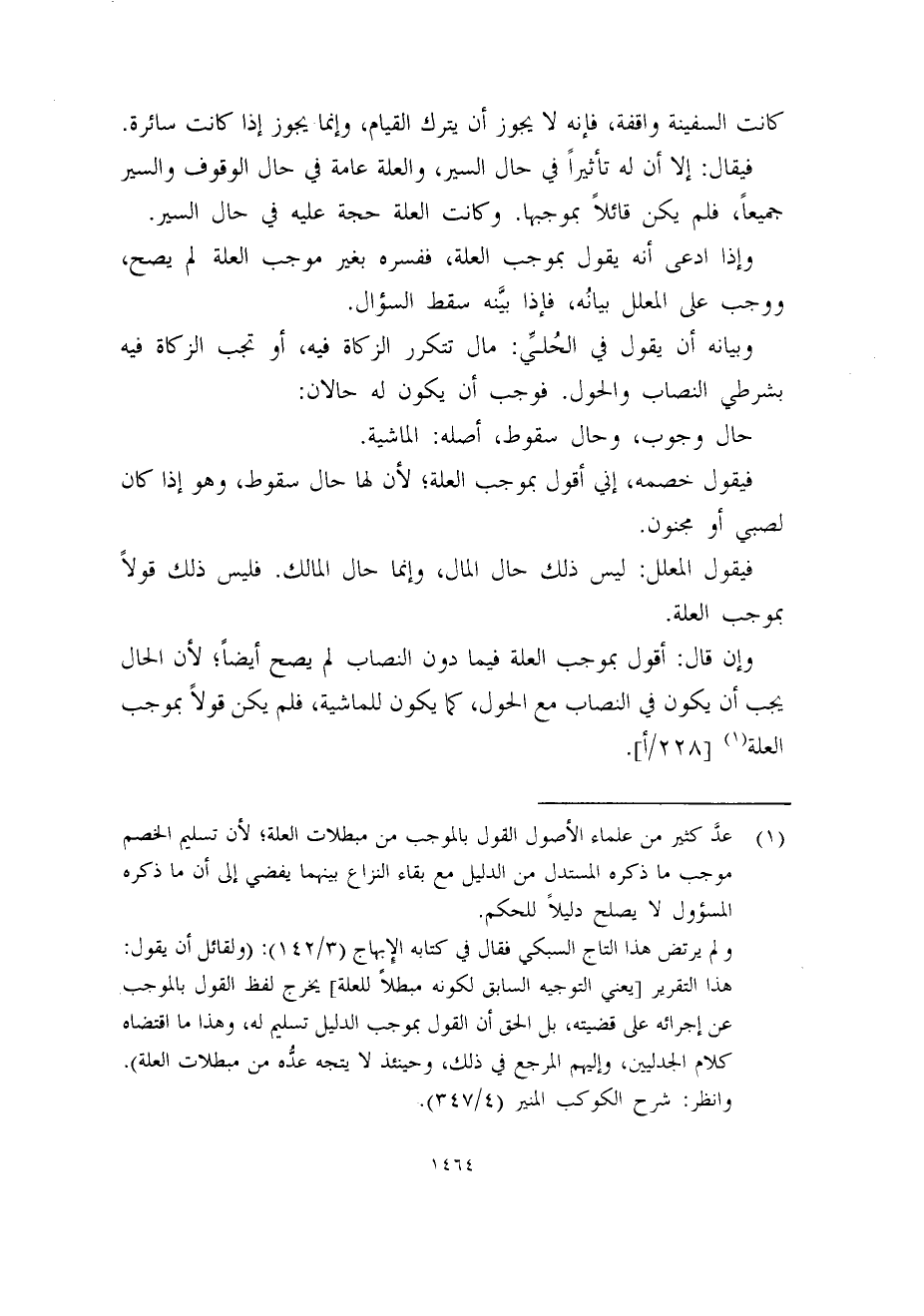 فيقول خصمه، إني أقول بموجب العلة؛ لأن لها حال سقوط، وهو إذا كان لصبي أو مجنون.