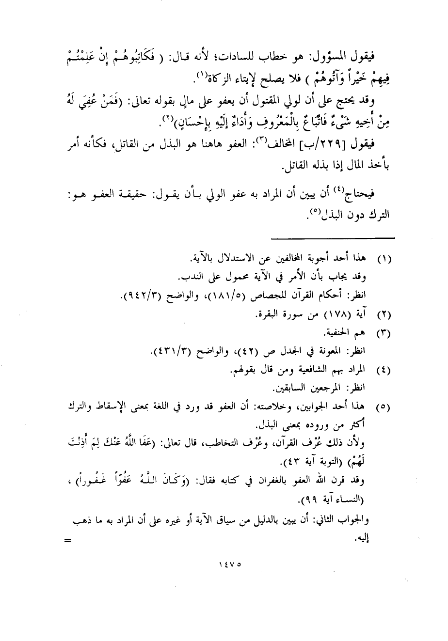 (5) هذا أحد الجوابين، وخلاصته: أن العفو قد ورد في اللغة بمعنى الإِسقاط والترك أكثر من وروده بمعنى البذل.