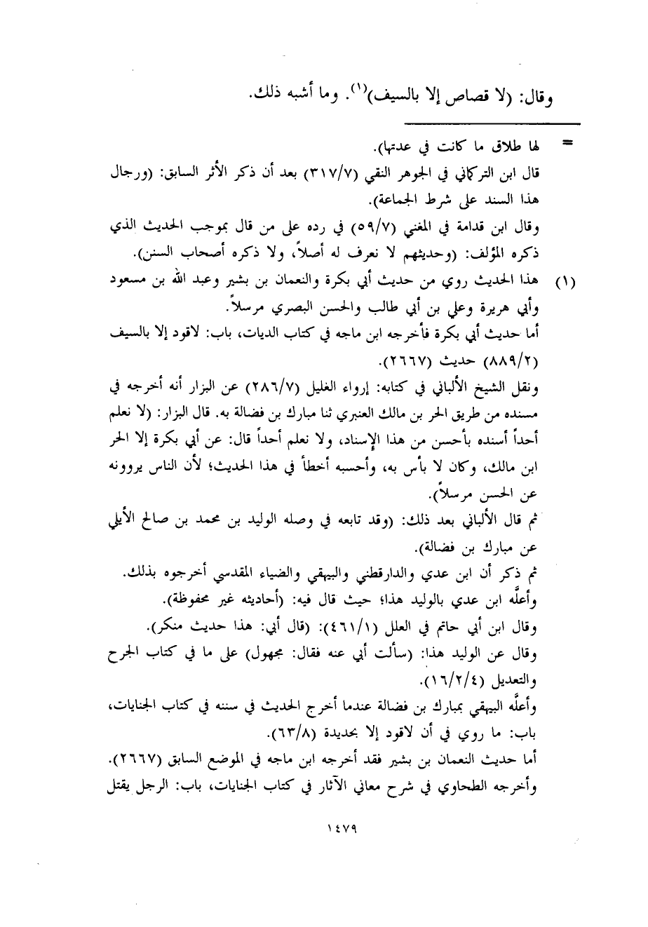 وقال ابن قدامة في المغني (7/59) في رده على من قال بموجب الحديث الذى ذكره المؤلف: (وحديثهم لا نعرف له أصلاً، ولا ذكره أصحاب السنن) .