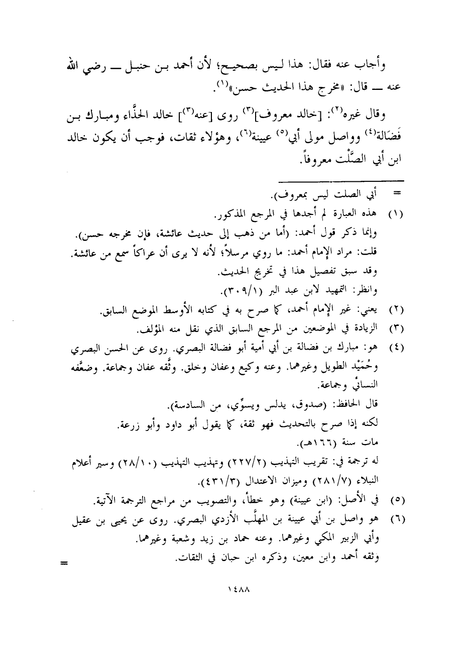 وفال غيره (2) : [خالد معروف] (3) روى [عنه (3) ] خالد الحذَّاء ومبارك بن فَضَالة (4) وواصل مولى أبي (5) عيينة (6) ، وهؤلاء ثقات، فوجب أن يكون خالد ابن أبي الصَّلْت معروفاً.