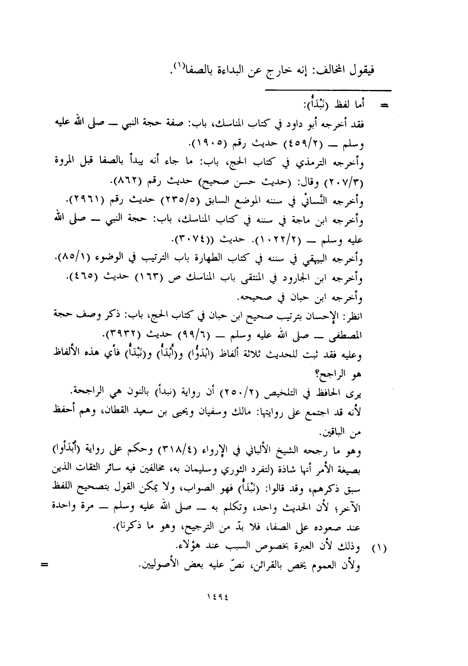 وهو ما رجحه الشيخ الألباني في الإِرواء (4/318) وحكم على رواية (ابدَأوا) بصيغة الأمر أنها شاذة لتفرد الثوري وسليمان به، مخالفين فيه سائر الثقات الذين سبق ذكرهم، وقد قالوا: (نَبْدَأُ) فهو الصواب، ولا يمكن القول بتصحيح اللفظ الآخر؛ لأن الحديث واحد، وتكلم به - صلى الله عليه وسلم - مرة واحدة عند صعوده على الصفا، فلا بدّ من الترجيح، وهو ما ذكرنا) .