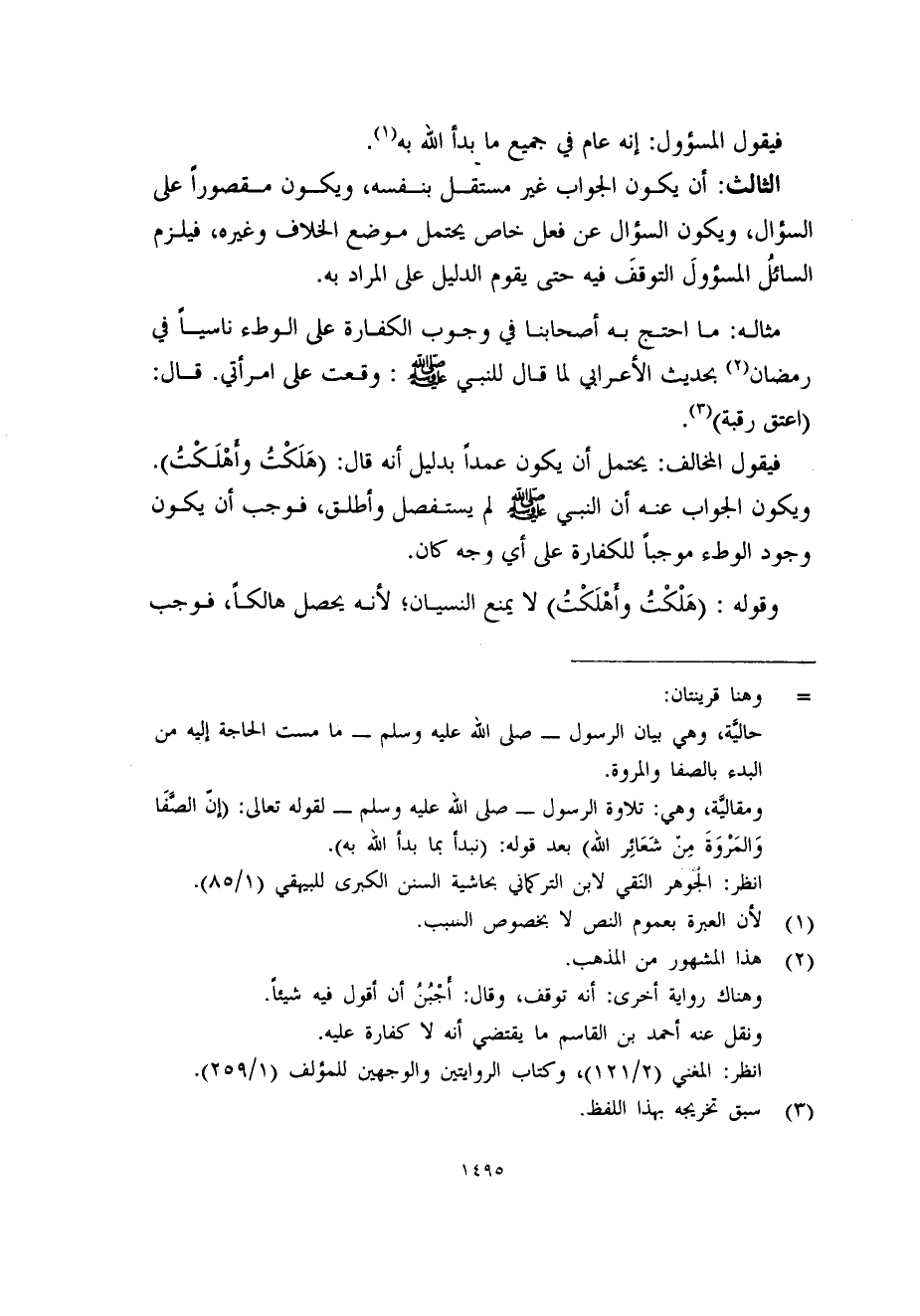 الثالث: أن يكون الجواب غير مستقل بنفسه، ويكون مقصوراً على السؤال، ويكون السؤال عن فعل خاص يحتمل موضع الخلاف وغيره، فيلزم السائلُ المسؤولَ التوقفَ فيه حتى يقوم الدليل على المراد به.