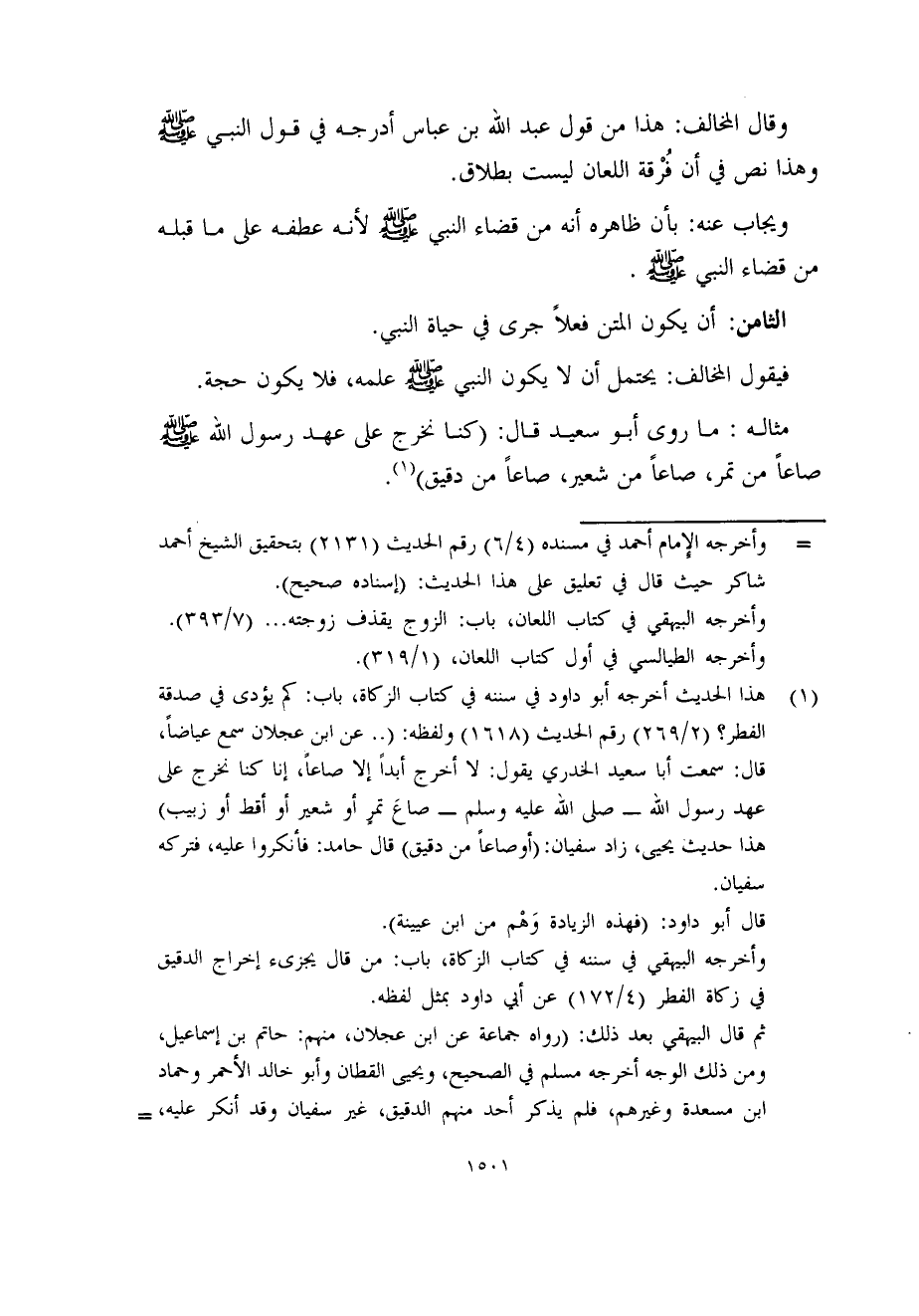 مثاله: ما روى أبو سعيد قال: (كنا نخرج على عهد رسول الله - صلى الله عليه وسلم - صاعاً من تمر، صاعاً من شعير، صاعاً من دقيق) (1) .