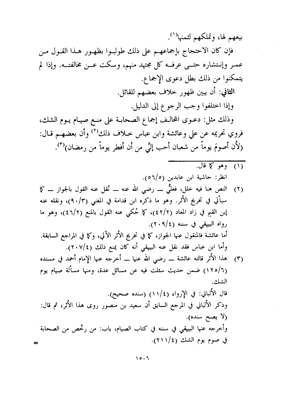 وذلك مثل: دعوى المخالف إجماع الصحابة على منع صيام يوم الشك، فروي تحريمه عن علي وعائشة وابن عباس خلاف ذلك (2) وأن بعضهم قال: (لأن أصومَ يوماً من شعبان أحب إليَّ من أن أفطر يوماً من رمضان) (3) .