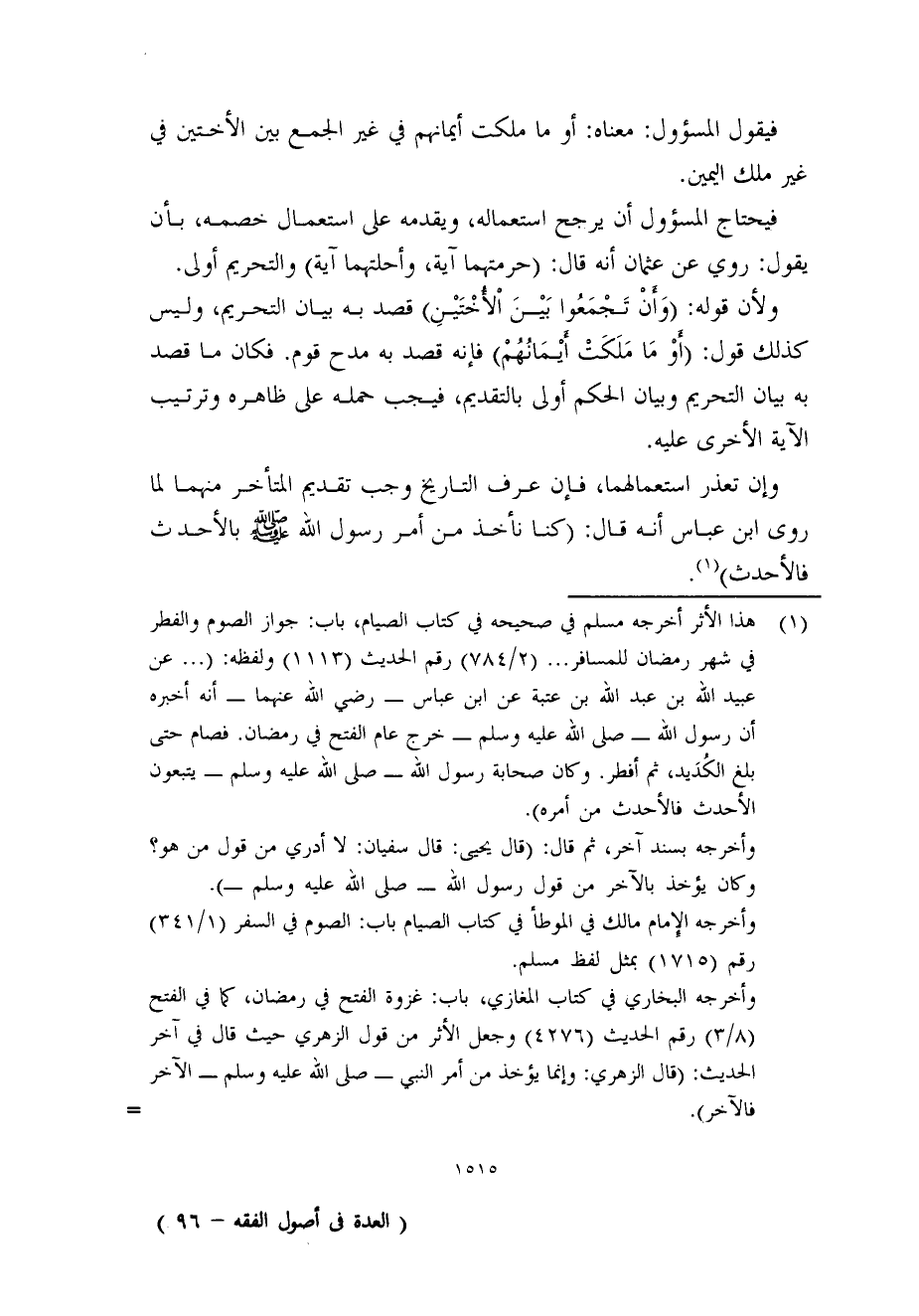 فيحتاج المسؤول أن يرجح استعماله، ويقدمه على استعمال خصمه، بأن يقول: روي عن عثمان أنه قال: (حرمتهما آية، وأحلتهما آية) والتحريم أولى.