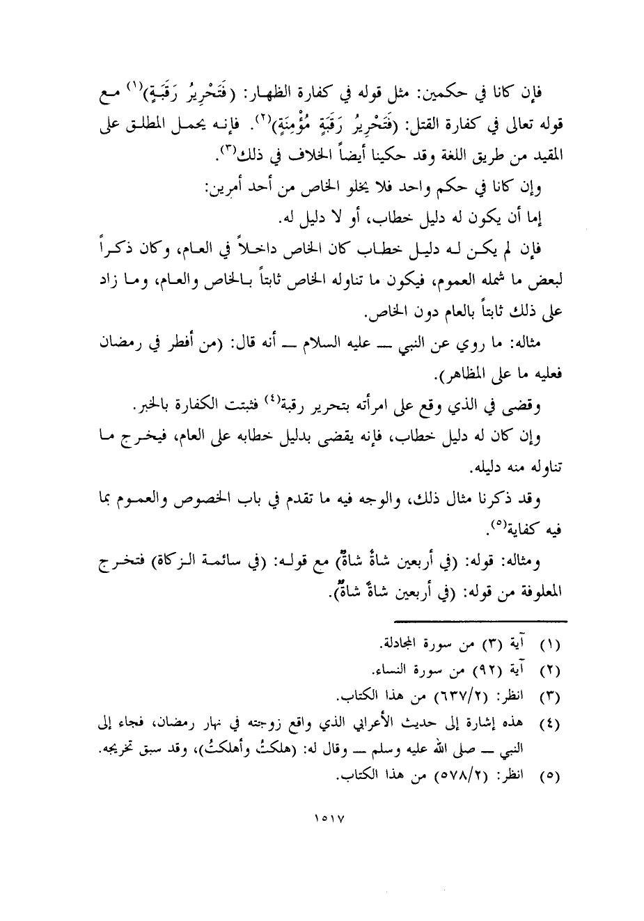وقد ذكرنا مثال ذلك، والوجه فيه ما تقدم في باب الخصوص والعموم بما فيه كفاية (5) .