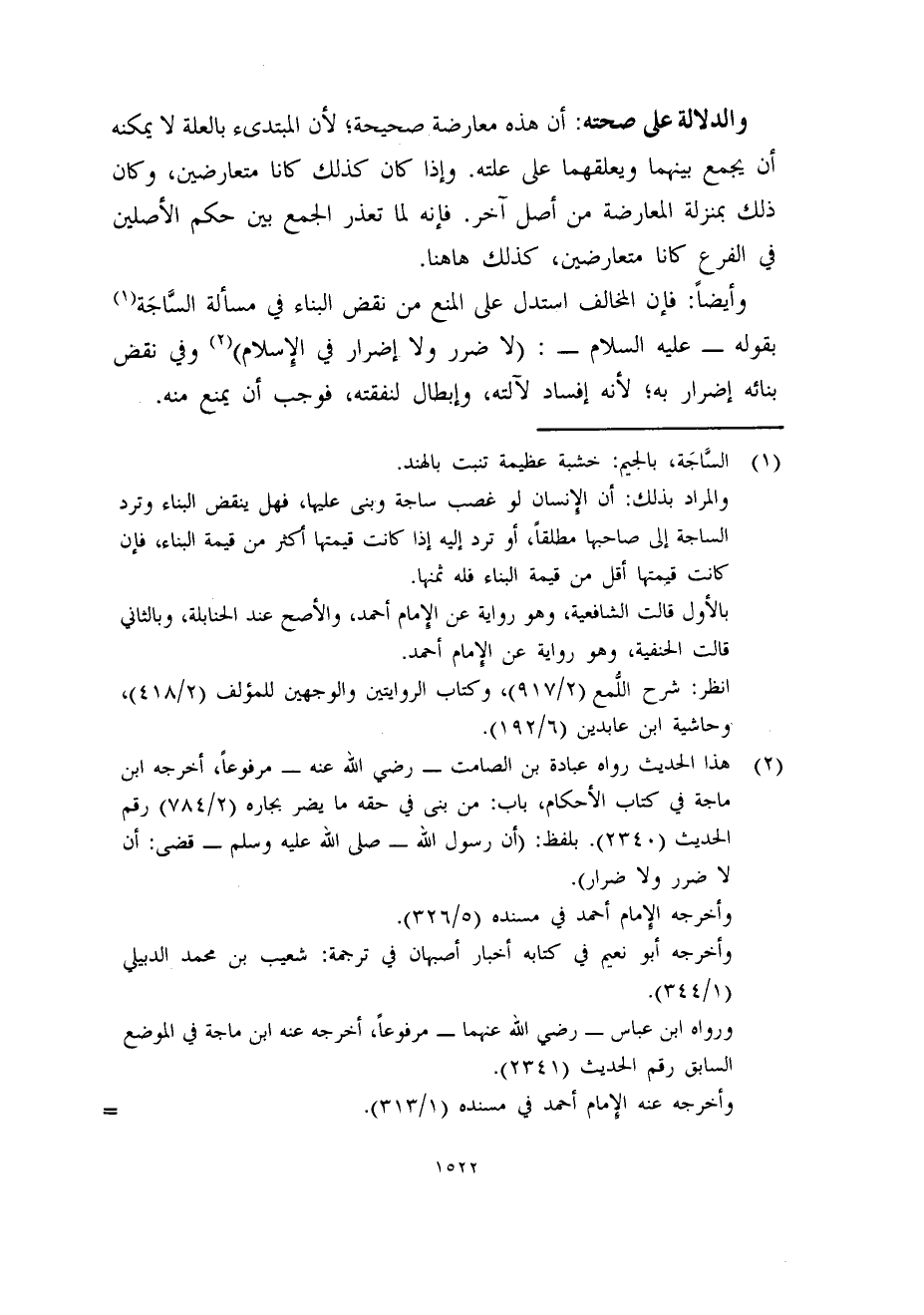 (2) هذا الحديث رواه عبادة بن الصامت - رضي الله عنه - مرفوعاً، أخرجه ابن ماجة في كتاب الأحكام، باب: من بنى في حقه ما يضر بجاره (2/784) رقم الحديث (2340) . بلفظ: (أن رسول الله - صلى الله عليه وسلم - قضى: أن لا ضرر ولا ضرار) .