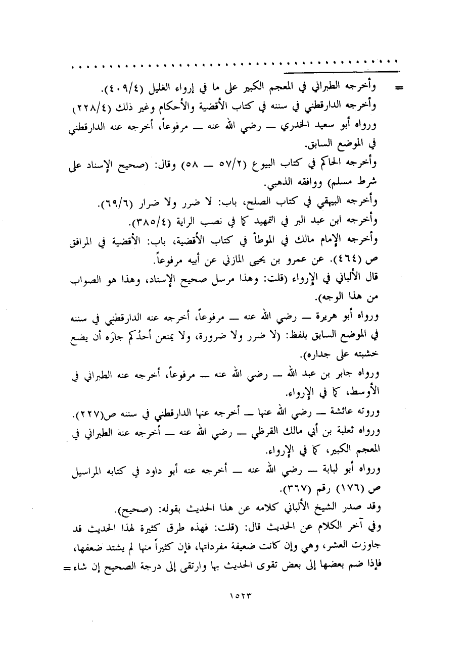 وأخرجه الدارقطني في سننه في كتاب الأقضية والأحكام وغير ذلك (4/228) ورواه أبو سعيد الخدري - رضي الله عنه - مرفوعاً، أخرجه عنه الدارقطني في الموضع السابق.