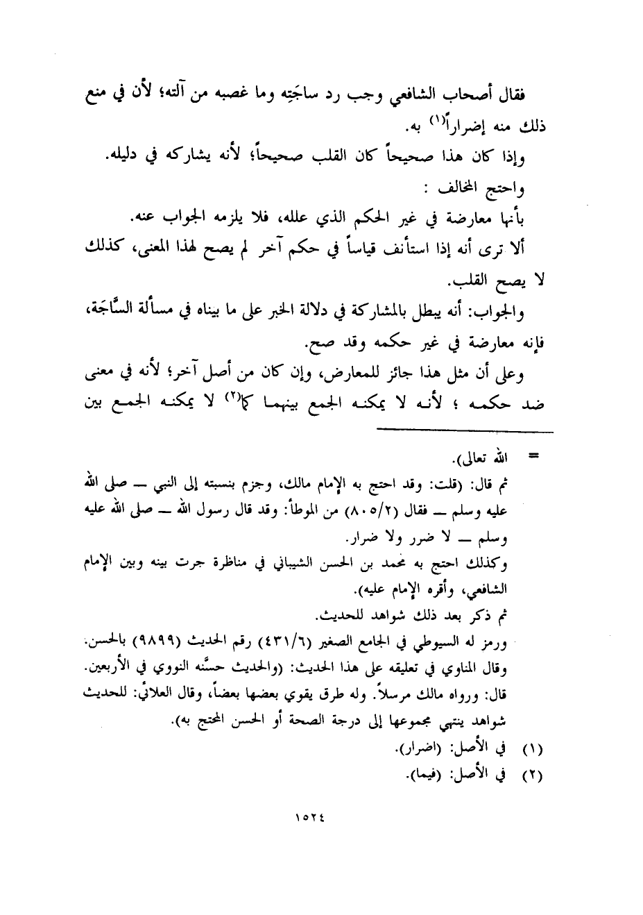 ثم قال: (قلت: وقد احتج به الإمام مالك، وجزم بنسبته إلى النبي - صلى الله عليه وسلم - فقال (2/805) من الموطأ: وقد قال رسول الله - صلى الله عليه وسلم - لا ضرر ولا ضرار.