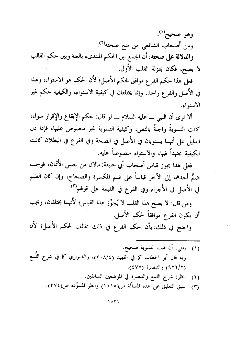 ومن قال: لا يصح هذا القلب لا يُجوِّز هذا القياس؛ لأنهما يختلفان، ويجب أن يكون الفرع موافقاً لحكم الأصل.