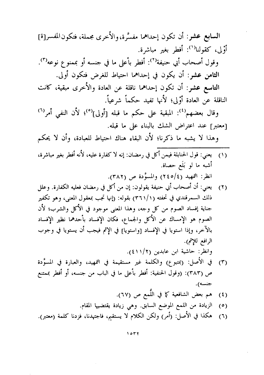 (3) في الأصل: (بمتبوع) والكلمة غير مستقيمة في التمهيد، والعبارة في المسوَّدة ص (383) : (وقول الحنفية: أفطر بأعلى ما في الباب من جنسه، أو أفطر بممتنع جنسه) .