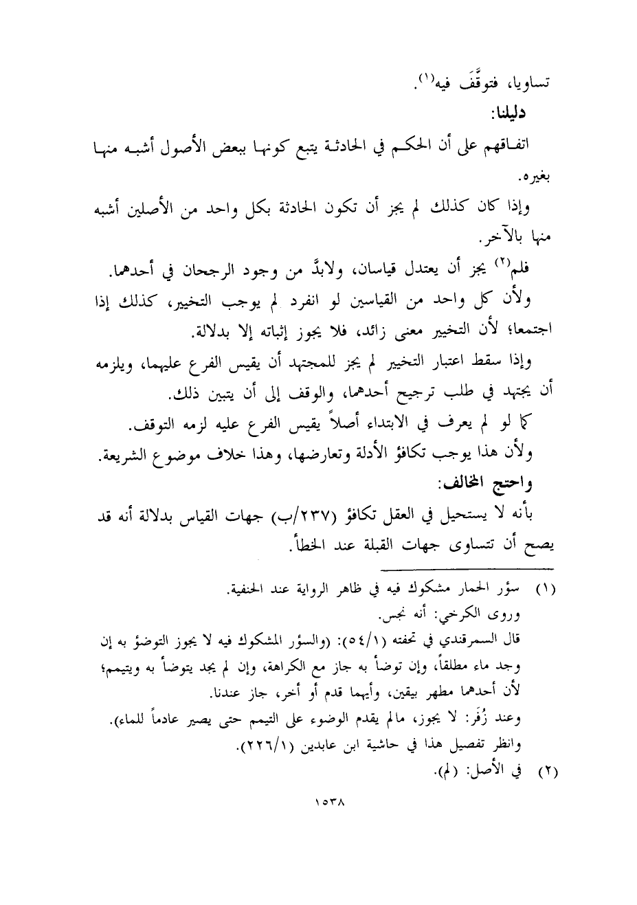 بأنه لا يستحيل في العقل تكافؤ (237/ب) جهات القياس بدلالة أنه قد يصح أن تتساوى جهات القبلة عند الخطأ.
