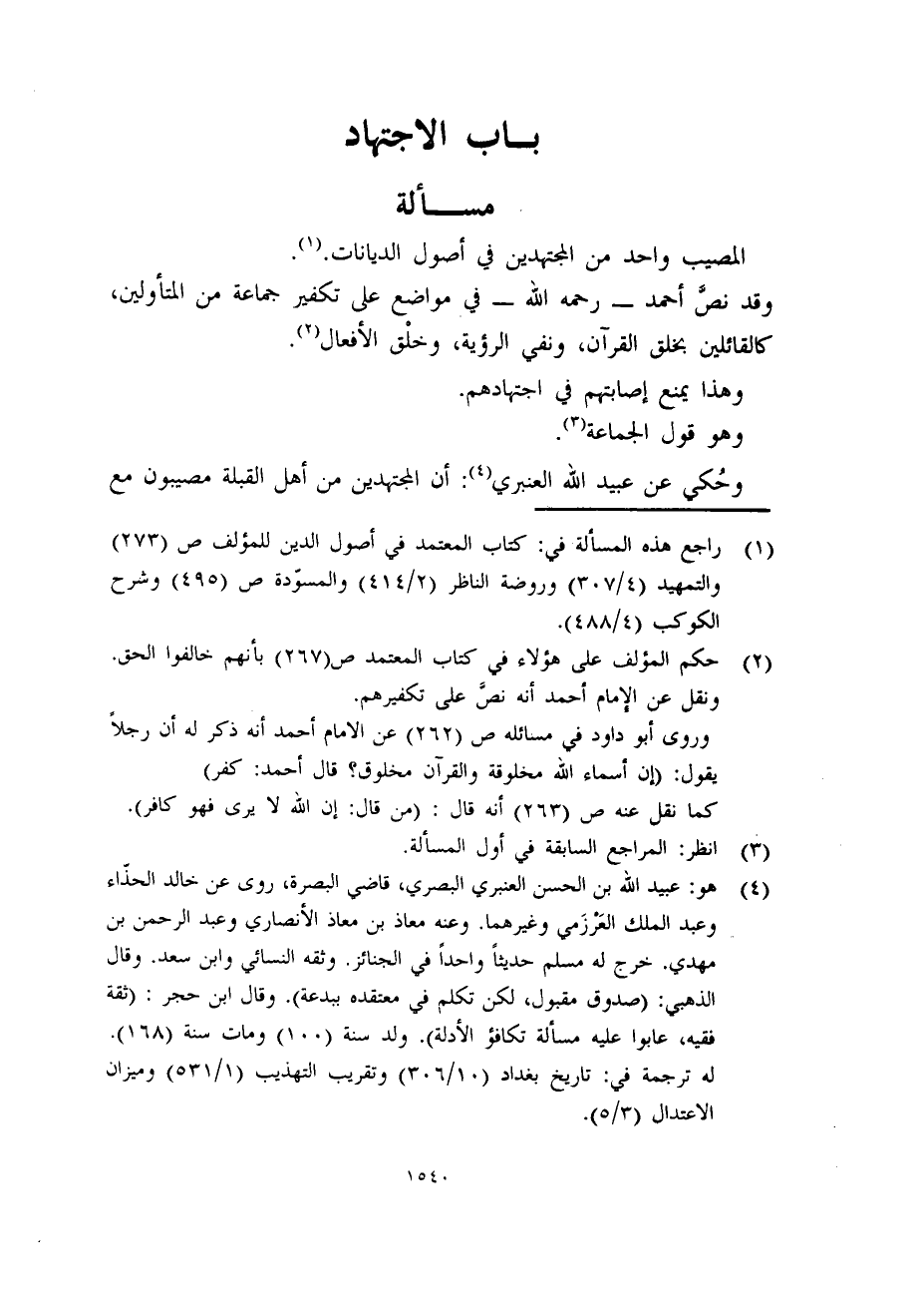 وحُكي عن عبيد الله العنبري (4) : أن المجتهدين من أهل القبلة مصيبون مع