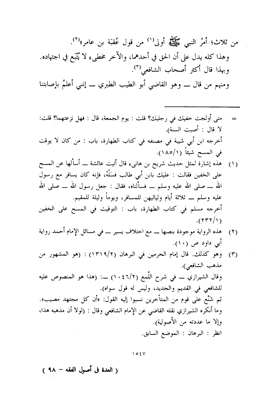(1) هذه إشارة لمثل حديث شريح بن هانىء قال أتيت عائشة -أسألها عن المسح على الخفين فقالت: عليك بابن أبي طالب فسَلْهُ، فإنه كان يسافر مع رسول الله - صلى الله عليه وسلم - فسألناه، فقال: جعل رسول الله - صلى الله عليه وسلم - ثلاثة أيام ولياليهن للمسافر، ويوماً وليلة للمقيم.