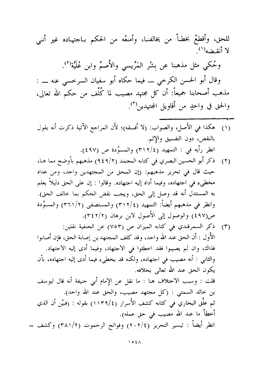 (2) ذكر أبو الحسين البصري في كتابه المعتمد (2/949) مذهبهم بأوضح مما هنا، حيث قال في تحرير مذهبهم: (إن المحق من المجتهدين واحد، ومن عداه مخطىء في اجتهاده، وفيما أداه إليه اجتهاده. وقالوا: إن على الحق دليلاً يعلم به المستدل أنه قد وصل إلى الحق، ويجب نقض الحكم بما خالف الحق) .