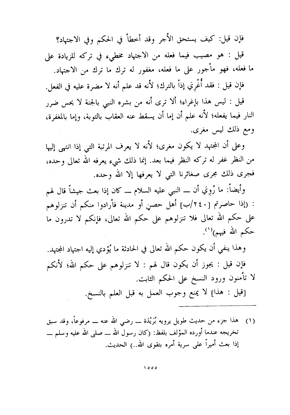 وأيضاً: ما رُوِيَ أن -النبي عليه السلام- كان إذا بعث جيشاً قال لهم: (إذا حاصرتم [240/ب] أهل حصنِ أو مدينة فأرادوا منكم أن تنزلوهم على حكم الله تعالى فلا تنزلوهم على حكم الله تعالى، فإنكم لا تدرون ما حكم الله فيهم) (1) .