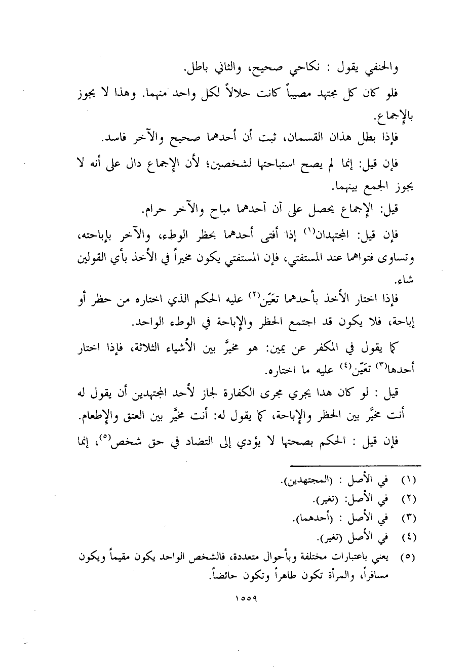 فإذا اختار الأخذ بأحدهما تعَيّن (2) عليه الحكم الذي اختاره من حظر أو إباحة، فلا يكون قد اجتمع الحظر والإِباحة في الوطء الواحد.
