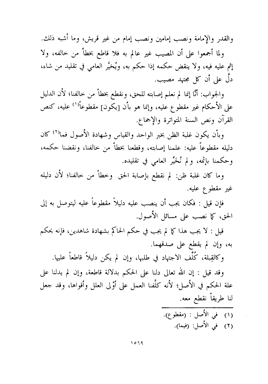وبأن يكون غلبة الظن بخبر الواحد والقياس وشهادة الأصول فما (2) كان دليله مقطوعاً عليه: علمنا إصابته، وقطعنا بخطأ من خالفنا، ونقضنا حكمه، وحكمنا بإثمه، ولم نُخَير العامي في تقليده.