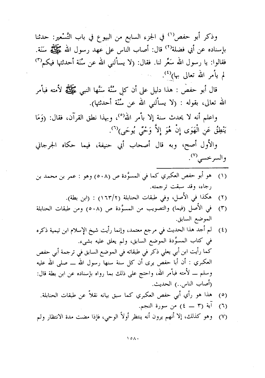 كما رأيت ابن أبي يعلي ذكر في طبقاته في الموضع السابق في ترجمة أبي حفص العكبري: أن أبا حفص يرى أن كل سنة سنها رسول الله - صلى الله عليه وسلم - لأمته فبأمر الله، واحتج على ذلك بما رواه بإسناده عن ابن بطة قال: (أصاب الناس..) الحديث.