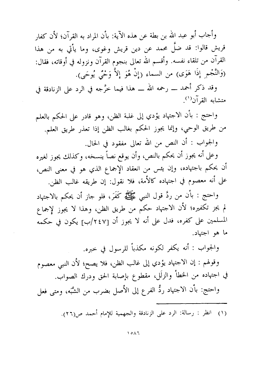 وقولهم: إن الاجتهاد يؤدي إلى غالب الظن، فلا يصح؛ لأن النبي معصوم في اجتهاده من الخطأ والزلَل، مقطوع بإصابة الحق ودرك الصواب.