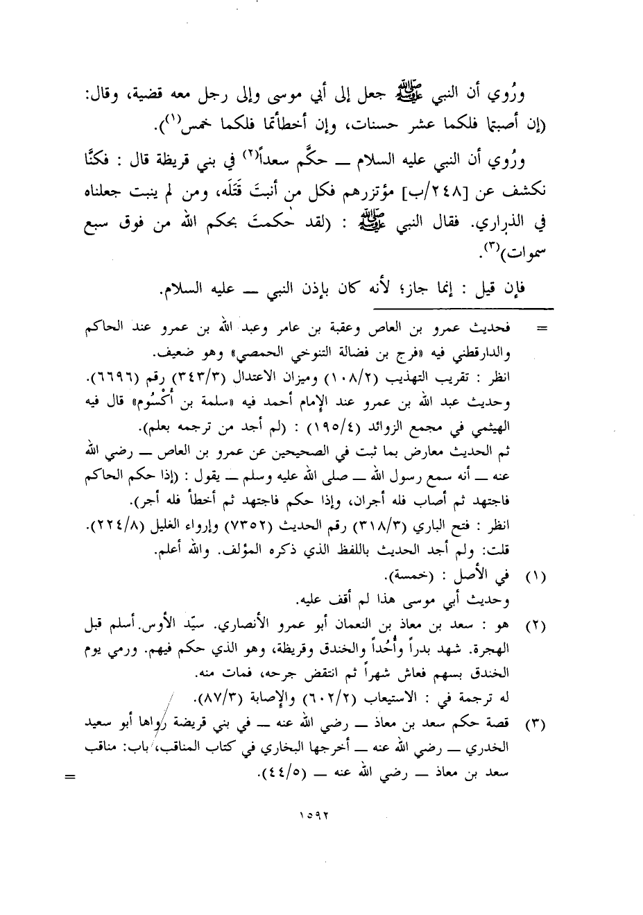 ورُوي أن النبي - صلى الله عليه وسلم - جعل إلى أبي موسى وإلى رجل معه قضية، وقال: (إن أصبتما فلكما عشر حسنات، وإن أخطأتما فلكما خمس (1)) .