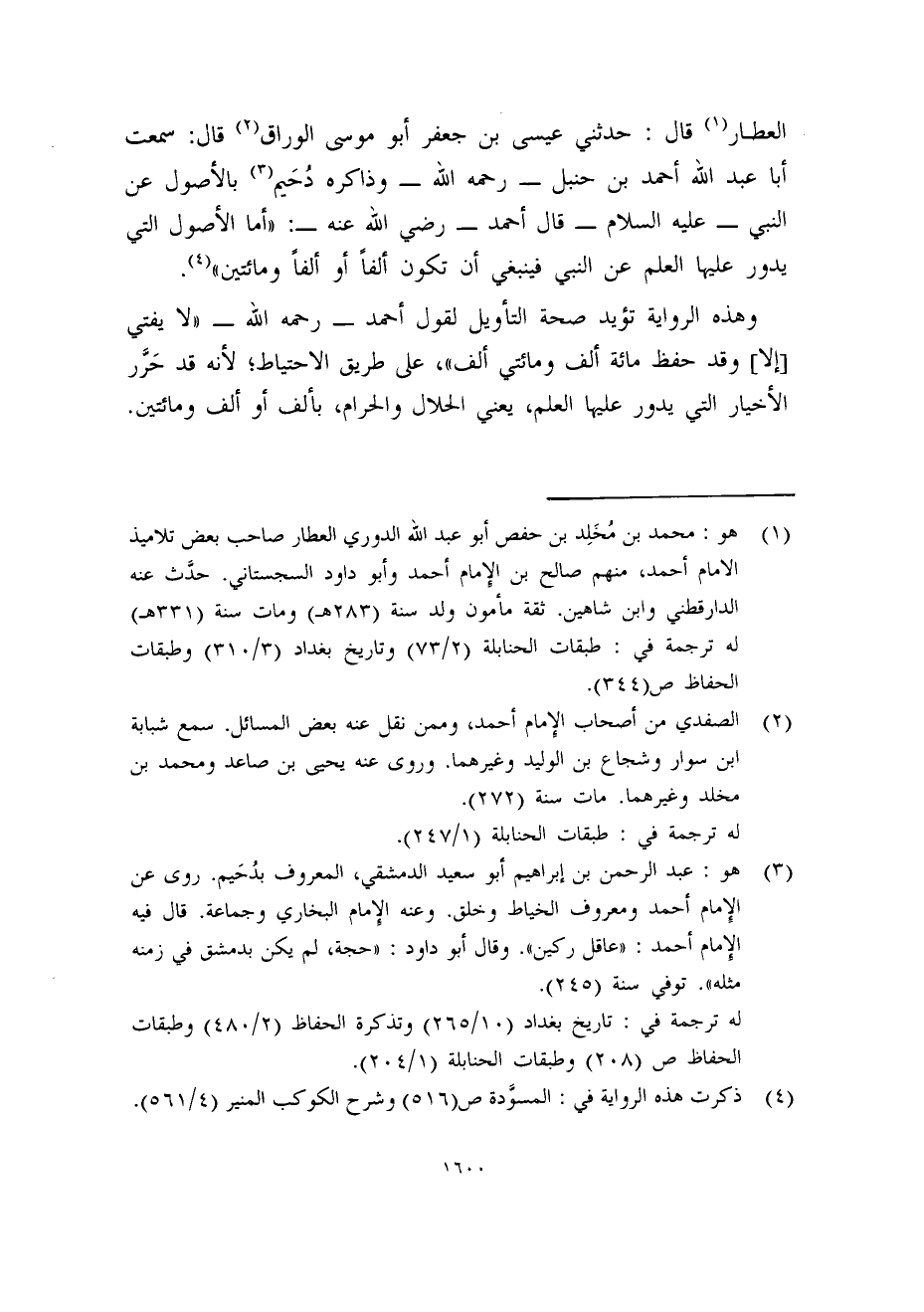 العطار (1) قال: حدثني عيسى بن جعفر أبو موسى الوراق (2) قال: سمعت أبا عبد الله أحمد بن حنبل -رحمه الله- وذاكره دُحَيم (3) بالأصول عن النبي -عليه السلام- قال أحمد - رضي الله عنه -: "أما الأصول التي يدور عليها العلم عن النبي فينبغي أن تكون ألفاً أو ألفاً ومائتين" (4) .