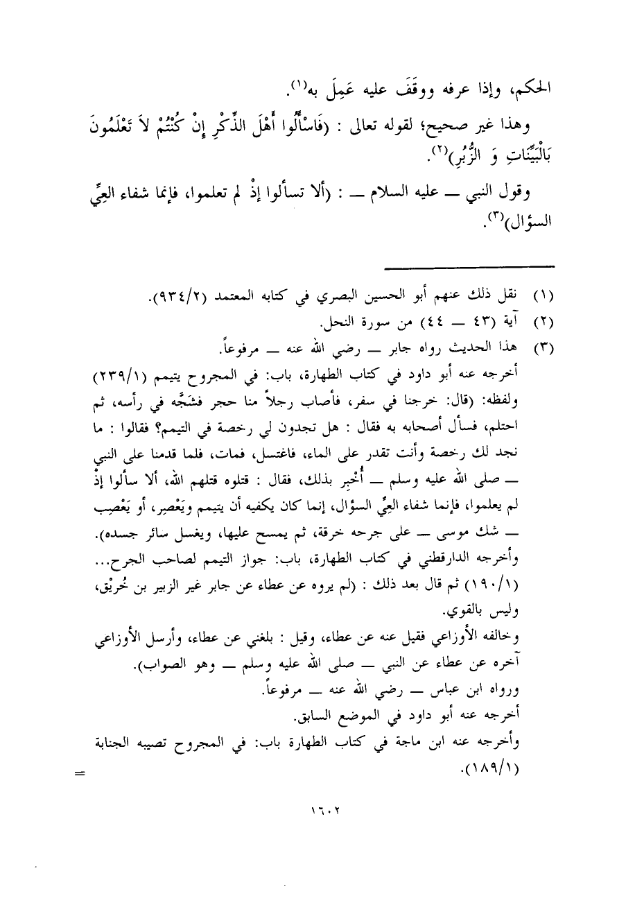 وقول النبي -عليه السلام-: (ألا تسألوا إذْ لم تعلموا، فإنما شفاء العِي السؤال) (3) .