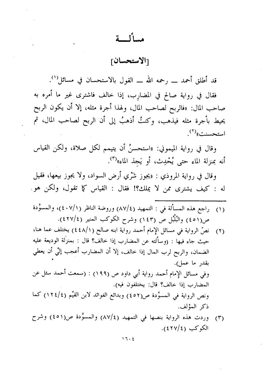(2) نصّ الرواية في مسائل الإِمام أحمد رواية ابنه صالح (1/448) يختلف عما هنا، حيث جاء فيها: (وسألته عن المضارب إذا خالف؟ قال: بمنزلة الوديعة عليه الضمان، والربح لرب المال إذا خالف، إلا أن المضارب أعجب إليَّ أن يعطي بقدر ما عمل) .