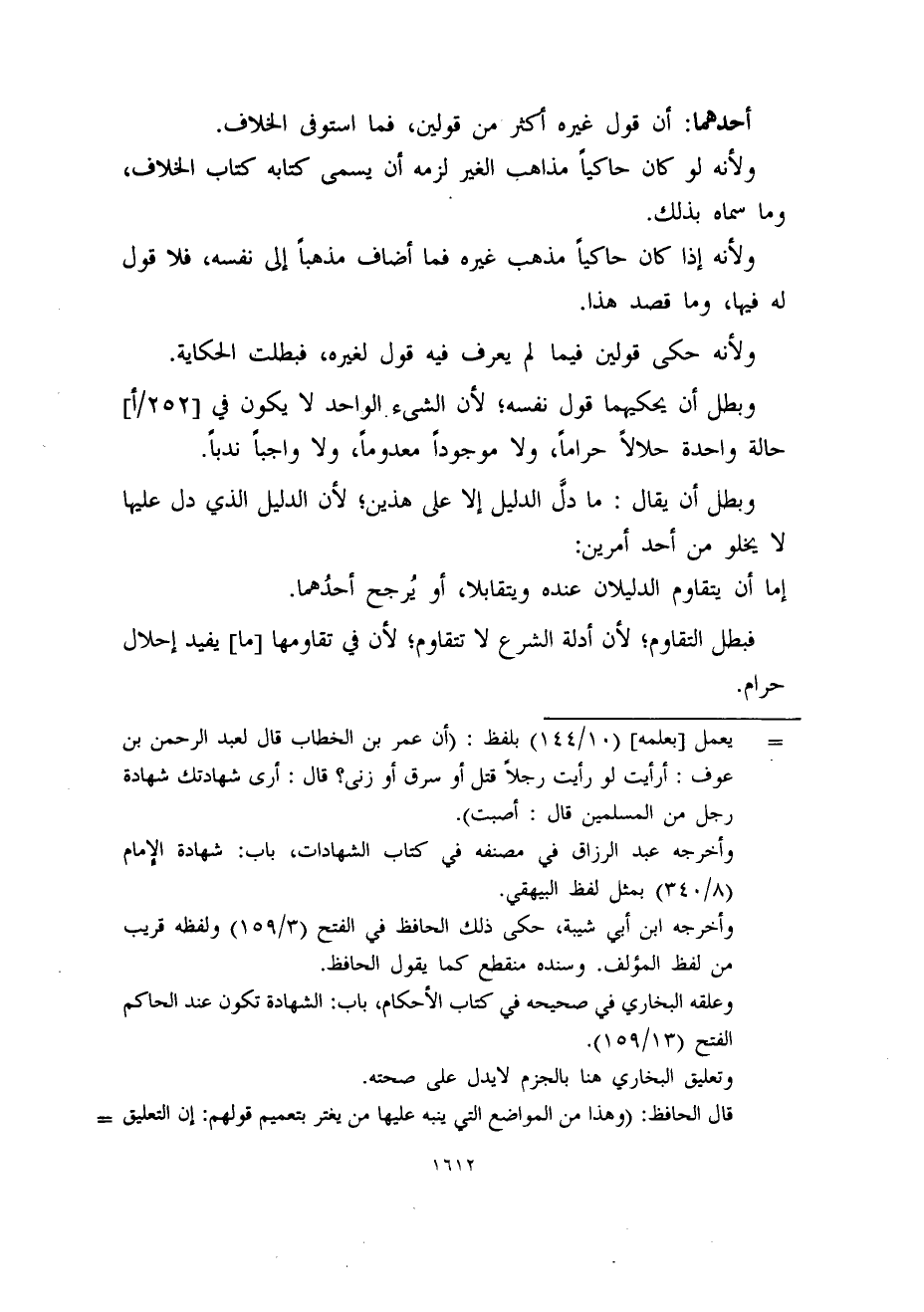وبطل أن يحكيهما قول نفسه؛ لأن الشىء الواحد لا يكون في [252/أ] حالة واحدة حلالاً حراماً، ولا موجوداً معدوماً، ولا واجباً ندباً.