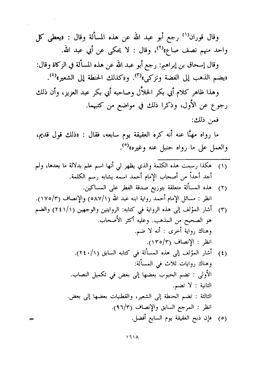 وقال قوران (1) رجع أبو عبد الله عن هذه المسألة وقال: "يعطى كل واحد منهم نصف صاع" (2) ، وقال: لا يحكى عن أبي عبد الله.