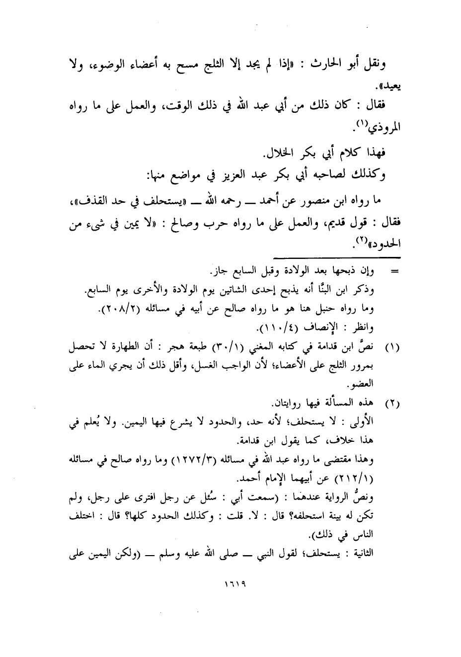 ما رواه ابن منصور عن أحمد -رحمه الله- "يستحلف في حد القذف"، فقال: قول قديم، والعمل على ما رواه حرب وصالح: "لا يمين في شىء من الحدود" (2) .