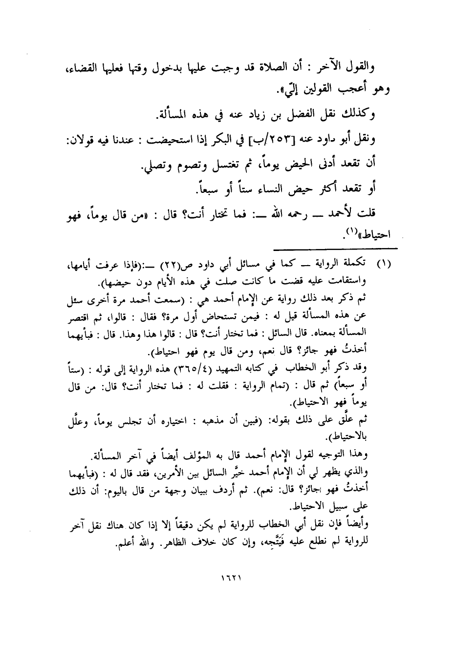 ثم ذكر بعد ذلك رواية عن الإمام أحمد هي: (سمعت أحمد مرة أخرى سئل عن هذه المسألة قيل له: فيمن تستحاض أول مرة؟ فقال: قالوا، ثم اقتصر المسألة بمعناه. قال السائل: فما تختار أنت؟ قال: قالوا هذا وهذا. قال: فبأيهما أخذتُ فهو جائز؟ قال نعم، ومن قال يوم فهو احتياط) .