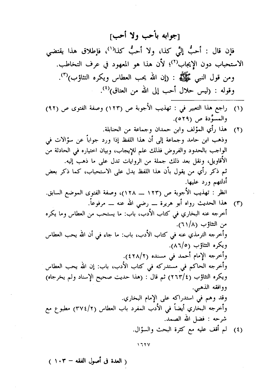 فإن قال: أحبُّ إليَّ كذا، ولا أحب كذا (1) ، فإطلاق هذا يقتضي الاستحباب دون الإيجاب (2) ؛ لأن هذا هو المعهود في عرف التخاطب.