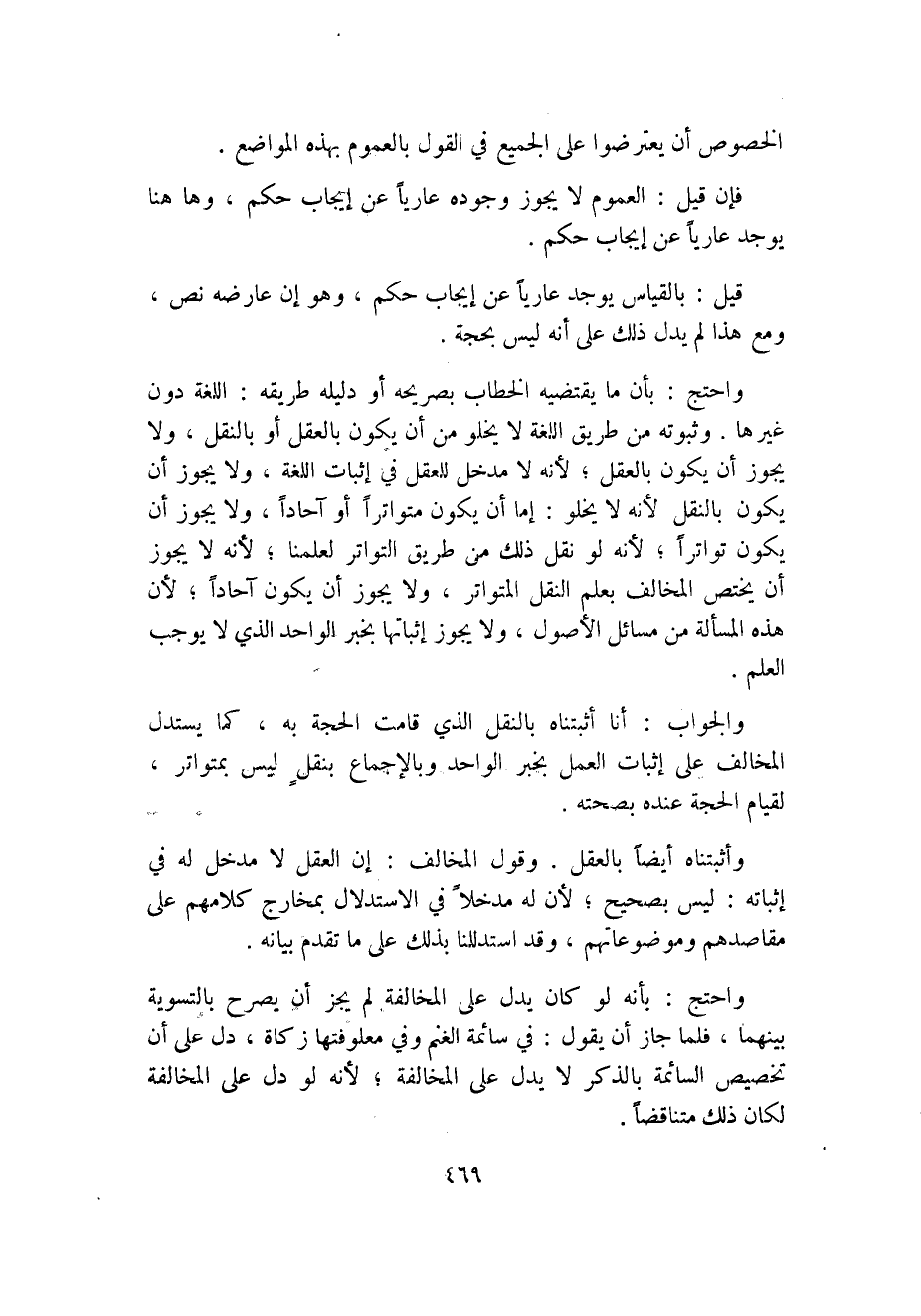 واحتج: بأن ما يقتضيه الخطاب بصريحه أو دليله طريقه اللغة دون غيرها، وثبوته من طريق اللغة لا يخلو من أن يكون بالعقل أو بالنقل، ولا يجوز أن يكون بالعقل؛ لأنه لا مدخل للعقل في إثبات اللغة، ولا يجوز أن يكون بالنقل لأنه لا يخلو: إما أن يكون متواترًا أو آحادًا، ولا يجوز أن يكون تواترًا؛ لأنه لو نقل ذلك من طريق التواتر لعلمنا؛ لأنه لا يجوز أن يختص المخالف بعلم النقل المتواتر، ولا يجوز أن يكون آحادًا؛ لأن هذه المسألة من مسائل الأصول, ولا يجوز إثباتها بخبر الواحد الذي لا يوجب العلم.
