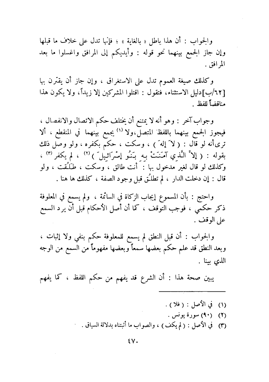 وجواب آخر: وهو أنه لا يمتنع أن يختلف حكم الاتصال والانفصال؛ فيجوز الجمع بينهما باللفظ المتصل، ولا1 يجمع بينهما في المنقطع، ألا ترى أنه لو قال: "لا إله"، وسكت؛ حكم بكفره، ولو وصل ذلك بقوله: {إِلَّا الَّذِي آمَنَتْ بِهِ بَنُو إِسْرائيلَ} 2، ولم يكفر3، وكذلك لو قال لغير مدخول بها: أنت طالق، وسكت؛ طلقت، ولو قال: إن دخلت الدار؛ لم تطلق قبل وجود الصفة، كذلك ههنا.