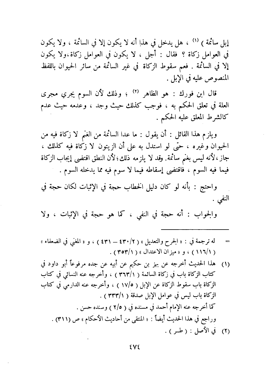 إبل سائمة" 1، هل يدخل في هذا أنه لا يكون إلا في السائمة، ولا يكون في العوامل زكاة؟ فقال: أجل، لا يكون في العوامل زكاة، ولا يكون إلا في السائمة؛ فعم سقوط الزكاة في غير السائمة من سائر الحيوان باللفظ المنصوص عليه في الإبل.