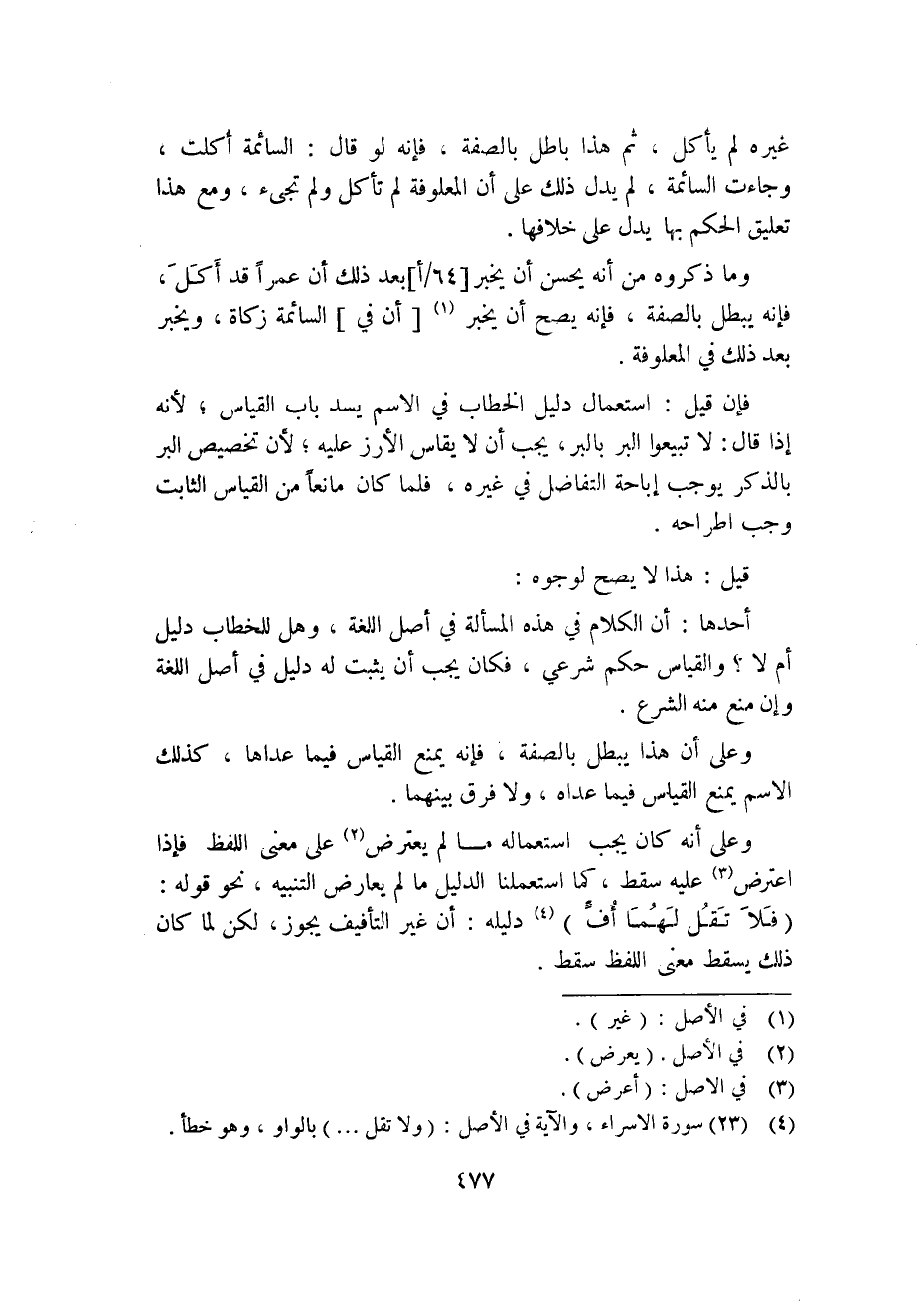 وعلى أنه كان يجب استعماله ما لم يعترض2 على معنى اللفظ؛ فإذا اعترض3 عليه؛ سقط، كما استعملنا الدليل ما لم يعارض التنبيه، نحو قوله: {فَلا تَقُلْ لَهُمَا أُفٍّ} 4 دليله: أن غير التأفيف يجوز، لكن لما كان ذلك يسقط معنى اللفظ؛ سقط.