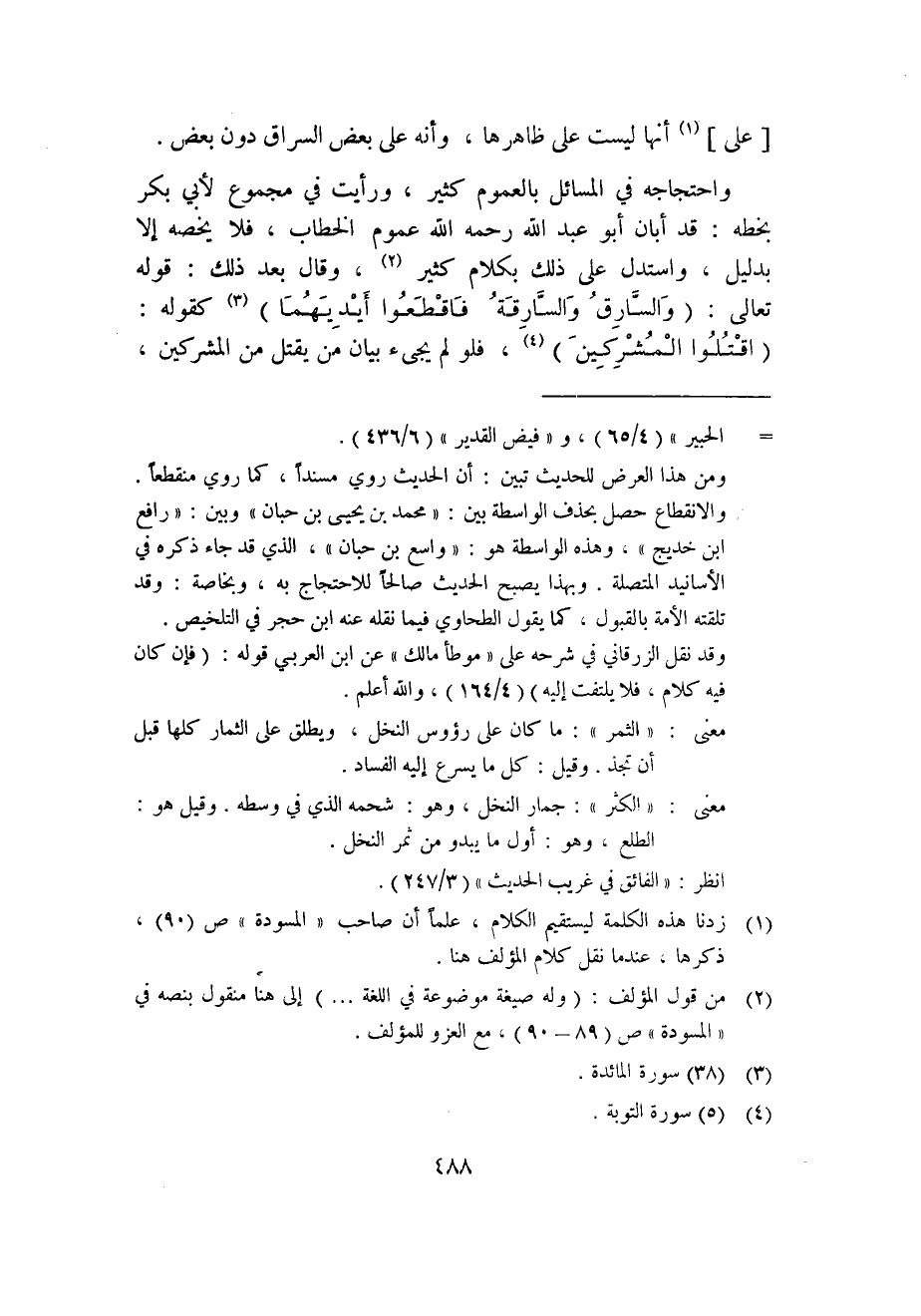 واحتجاجه في المسائل بالعموم كثير، ورأيت في مجموع لأبي بكر بخطه: قد أبان أبو عبد الله رحمه الله عموم الخطاب؛ فلا يخصه إلا بدليل، واستدل على ذلك بكلام كثير2، وقال بعد ذلك: قوله تعالى: {وَالسَّارِقُ وَالسَّارِقَةُ فَاقْطَعُوا أَيْدِيَهُمَا} 3 كقوله: {اقْتُلُوا الْمُشْرِكِينَ} 4؛ فلو لم يجئ بيان من يقتل من المشركين،