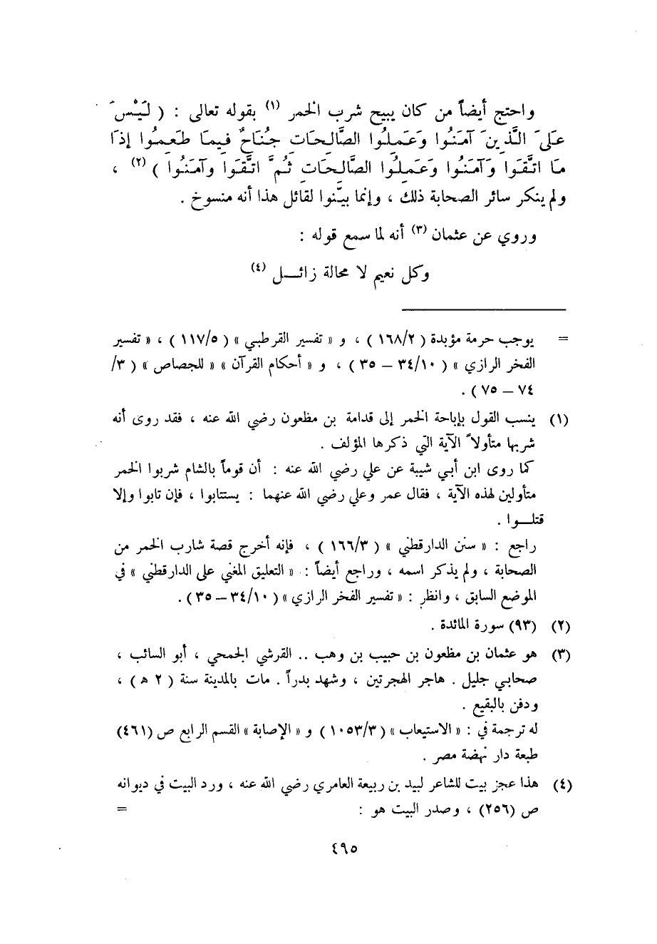 1 ينسب القول بإباحة الخمر إلى قدامة بن مظعون رضي الله عنه؛ فقد روي أنه شربها متأولًا الآية التي ذكرها المؤلف.