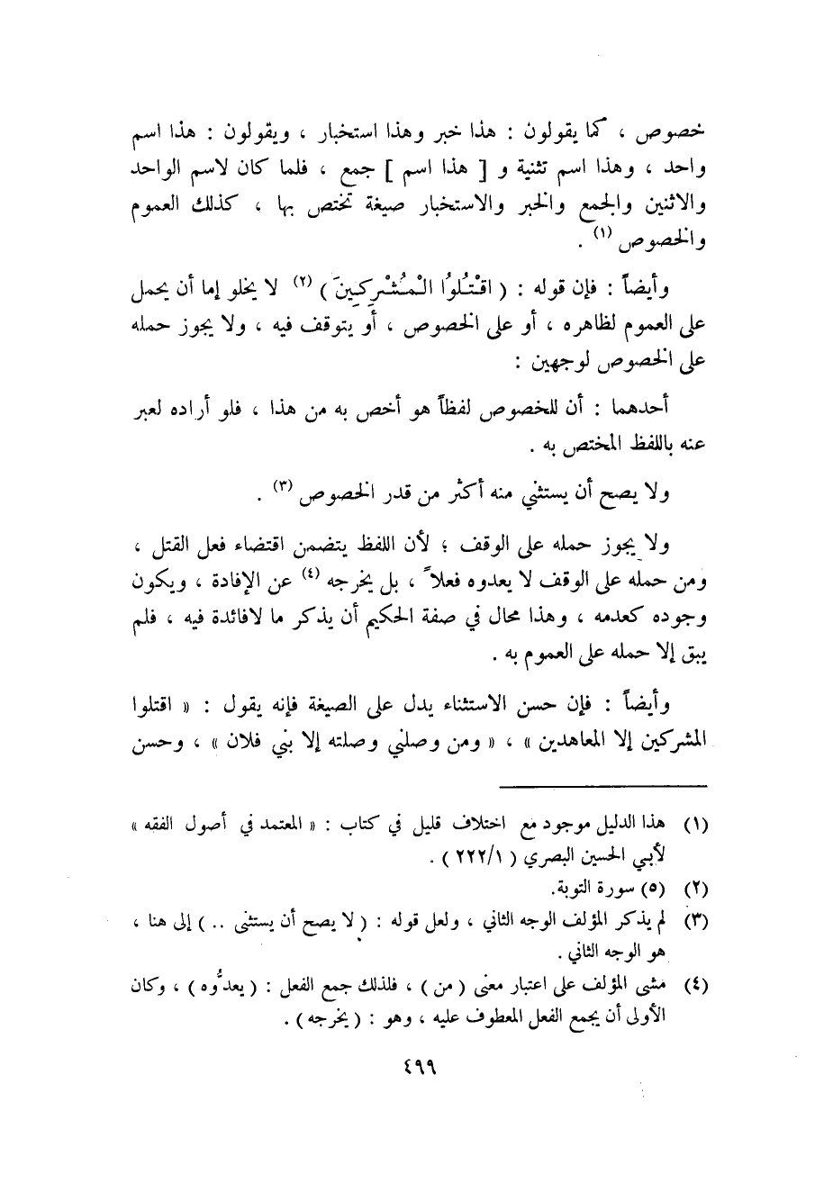 وأيضًا: فإن قوله: {اقْتُلُوا الْمُشْرِكِينَ} 2 لا يخلو إما أن يحمل على العموم لظاهره، أو على الخصوص، أو يتوقف فيه، ولا يجوز حمله على الخصوص لوجهين: