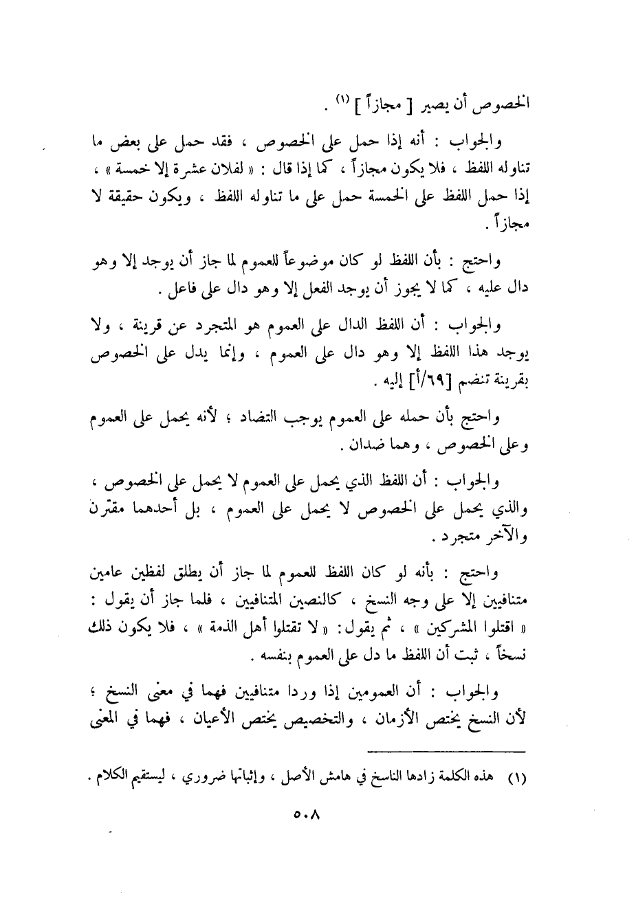 والجواب: أنه إذا حمل على الخصوص؛ فقد حمل على بعض ما تناوله اللفظ، فلا يكون مجازًا، كما إذا قال: "لفلان عشرة إلا خمسة"، إذا حمل اللفظ على الخمسة حمل على ما تناوله اللفظ، ويكون حقيقة لا مجازًا.