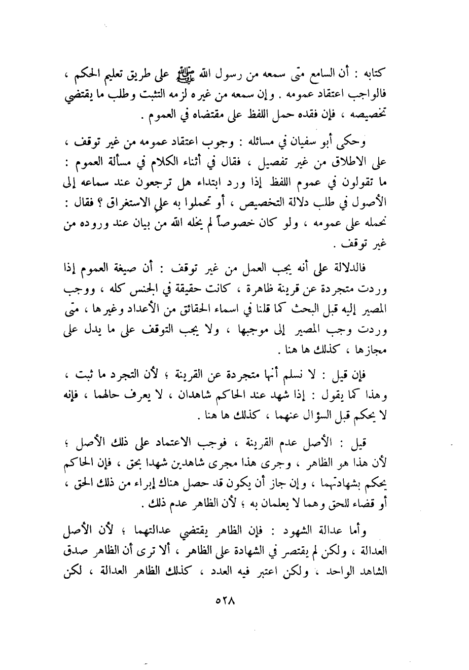كتابه: أن السامع متى سمعه من رسول الله صلى الله عليه وسلم على طريق تعليم الحكم؛ فالواجب اعتقاد عمومه. وإن سمعه من غيره؛ لزمه التثبت وطلب ما يقتضي تخصيصه، فإن فقده حمل اللفظ على مقتضاه في العموم.