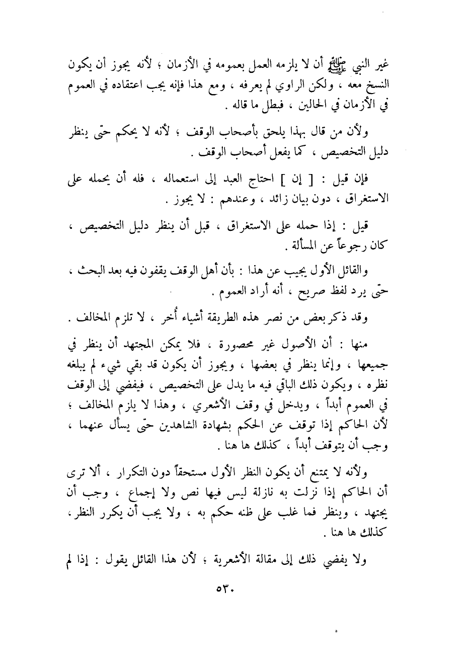 منها: أن الأصول غير محصورة؛ فلا يمكن المجتهد أن ينظر في جميعها؛ وإنما ينظر في بعضها، ويجوز أن يكون قد بقي شيء لم يبلغه نظره، ويكون ذلك الباقي فيه ما يدل على التخصيص، فيفضي إلى الوقف في العموم أبدًا، ويدخل في وقف الأشعري، وهذا لا يلزم المخالف؛ لأن الحاكم إذا توقف عن الحكم بشهادة الشاهدين حتى يسأل عنهما، وجب أن يتوقف أبدًا، كذلك ههنا.