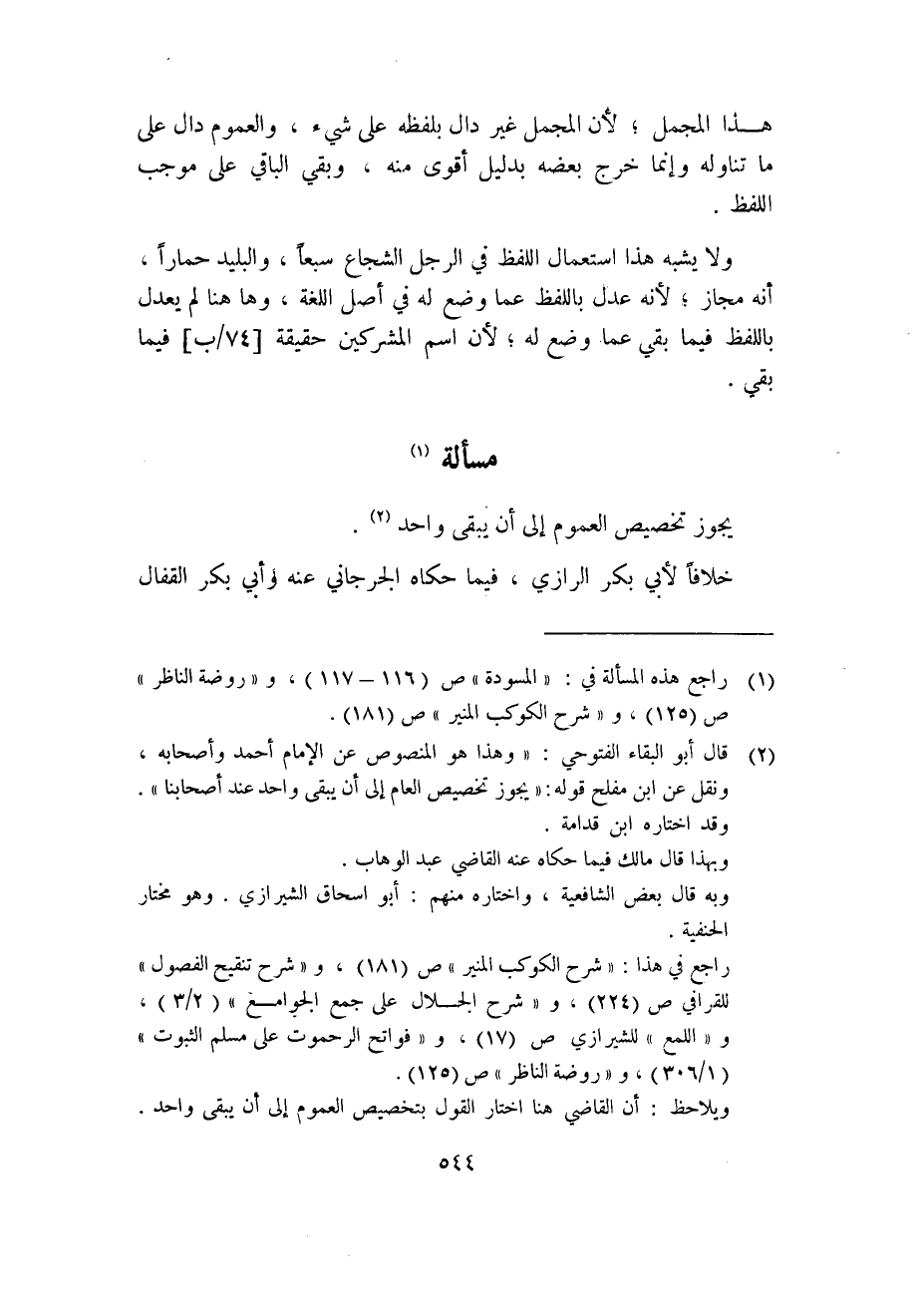 2 قال أبو البقاء الفتوحي: "وهذا هو المنصوص عن الإمام أحمد وأصحابه، ونقل عن ابن مفلح قوله: "يجوز تخصيص العام إلى أن يبقى واحد عن أصحابنا". وقد اختاره ابن قدامة.